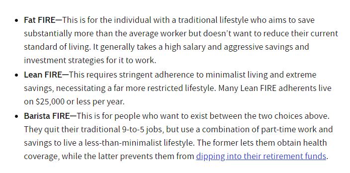 - Lean FIRE : 최소한의 자금으로 은퇴하여 생활비를 절약하며 사는 검소한 파이어족