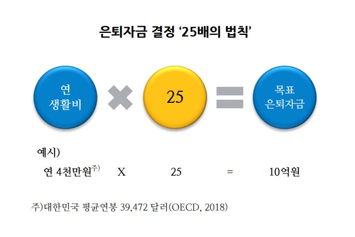 파이어족 은퇴자금을 계산하는 공식이 있었다. 일반적인 공식은 자신이 사용하는 연 생활비의 25를 곱하면 목표 은퇴자금이 된다는 것. 100세 시대에 25년이라고 하면 의아할 수 있는데, 모아놓은 목표 은퇴자금을 연평균 5~6% 세후 수익을 내는 곳에 투자하여 그중 4%만 생활비로 사용한다고 한다.