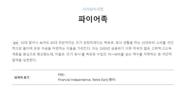 '경제적 자립(Financial Independence)'을 토대로 자발적 '조기 은퇴(Retire Early)'를 추진하는 사람들을 일컫는 용어이다. 이들은 일반적인 은퇴 연령인 50〜60대가 아닌 30대 말이나 늦어도 40대 초반까지는 조기 은퇴하겠다는 목표를 가지고 있다.