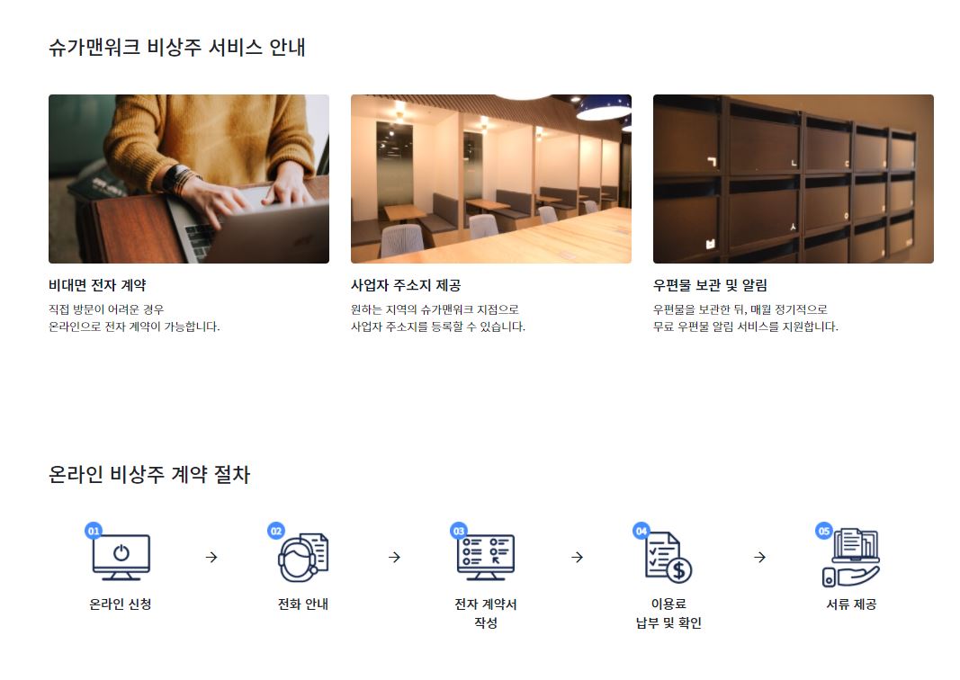 슈가맨워크의 비상주 서비스는 사업자 주소지를 제공해주는 것과 월1회 우편물을 취합하여 알려준다고 한다.