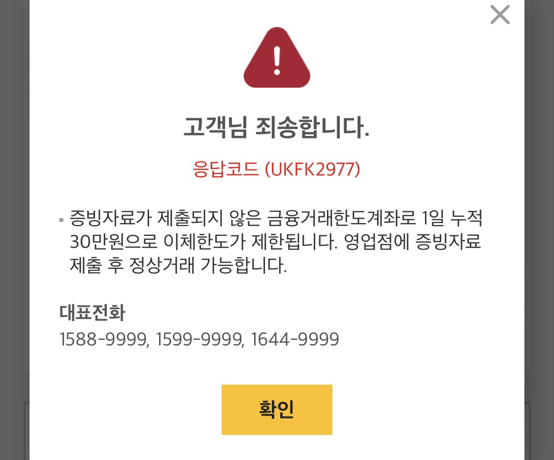 일단 고객센터에 전화해서 물어보니 이체 한도 해제는 영업점에서만 가능한데, 해제가 가능한지 확인해주시겠다고 했다. 신용카드가 있는지, 자동 이체 내역이 있는지 등등 이것저것을 확인하시더니 나는 영업점을 방문하여 서류를 제출해야 한다고.
