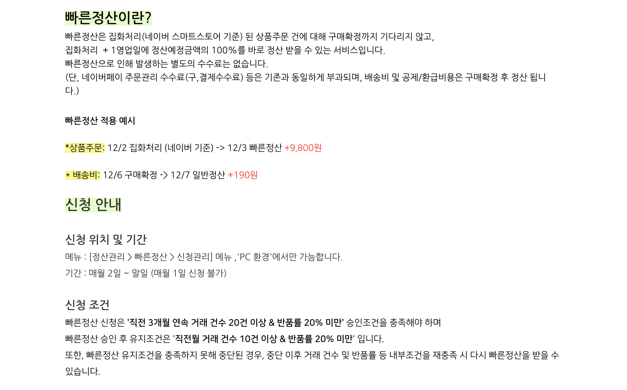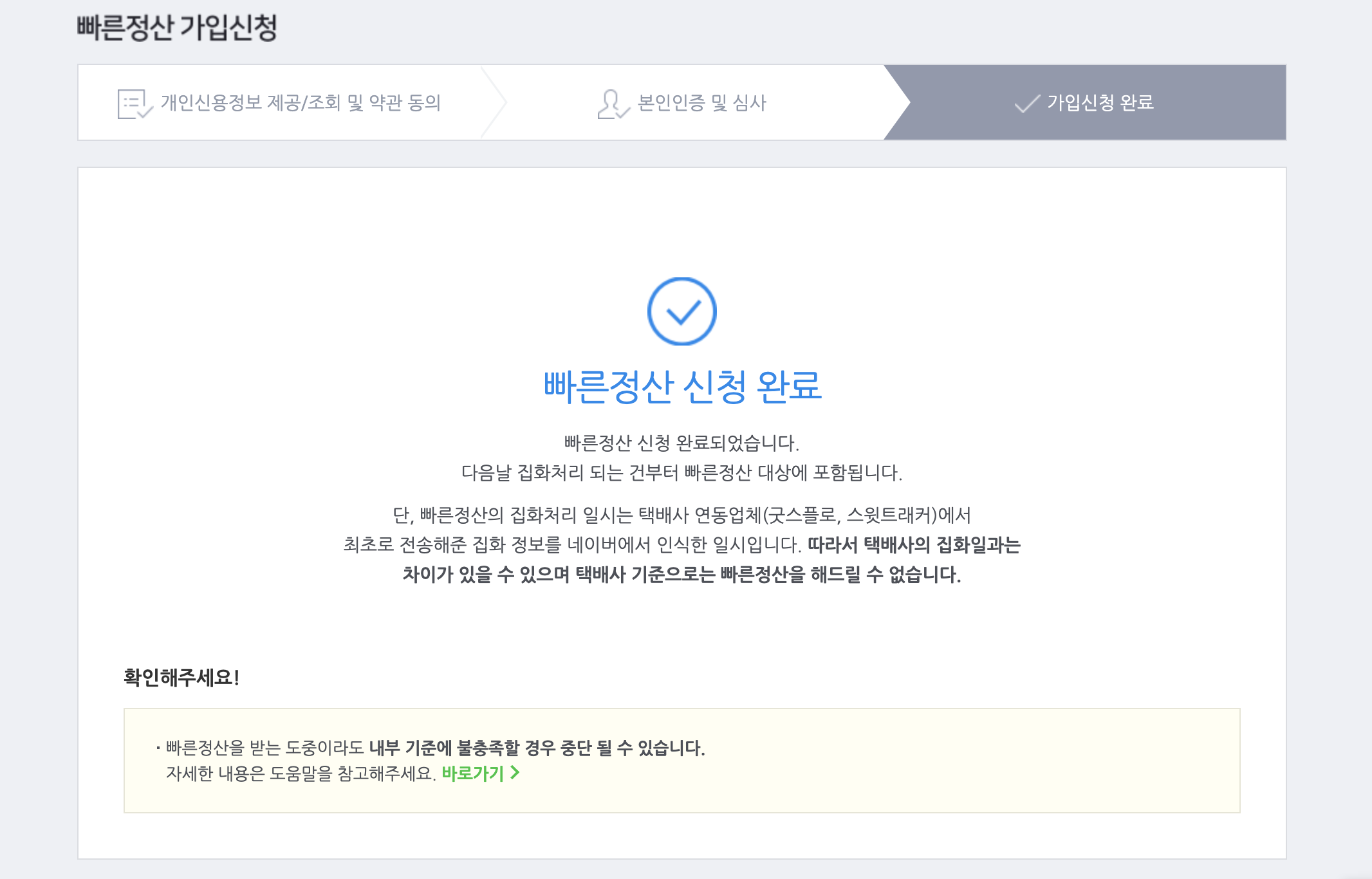 일반 정산 자체도 고객이 물건을 구매해서 배송을 받고 구매확정을 누르면 정산이 되기 때문에 상당히 빠르다고 느껴지는데, 일반 정산보다 더 빠른 정산을 받을 수 있는 빠른 정산이라는 제도가 있다.