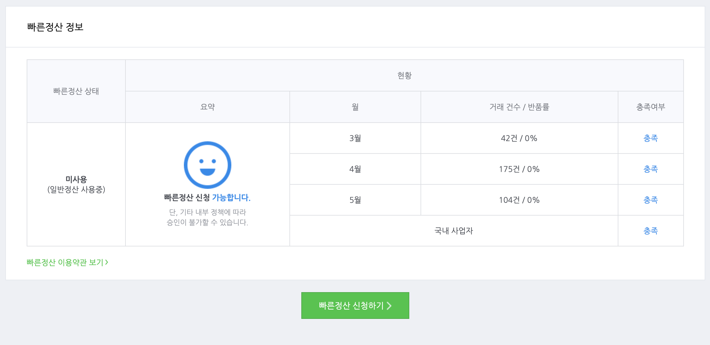 직전 3개월 연속 거래 건수 20건 이상이 되어야 하고 반품률이 20% 미만이여야 승인이 되고 직전 월 거래 건수 10건 이상과 반품률 20% 미만을 지켜져야 빠른 정산 서비스를 유지할 수 있다. 반품률이 높으면, 빠른 정산 서비스를 유지하기가 어렵다고 생각하면 된다.