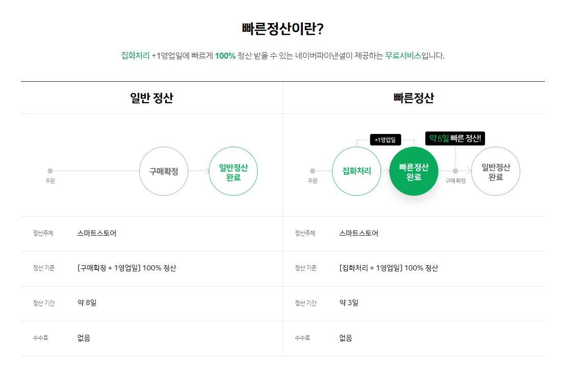 네이버 스마트스토어가 다른 플랫폼에 비해 가장 좋은 점이라하면, 정산이 빠르다는 것이다. 사업을 하다보면 자금의 흐름이 상당히 중요하다고 느껴지게 되는데, 스마트스토어의 판매 대금은 정산이 상당히 빠르게 이루어진다.