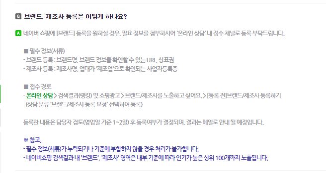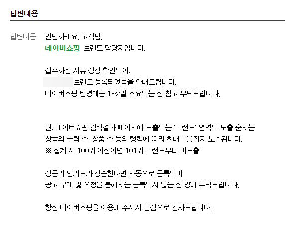 두번째에는 '네이버 쇼핑 브랜드 등록을 위해 ~외 브랜드 상품을 확인할 수 있는 추가 상품의 이미지 첨부 및 해당 상품의 URL을 기재하여 아래 정보 및 서류를 첨부하여 다시 문의해 주시면 신속히 확인하여 답변 드리겠습니다.' 라는 답변을 받았다.