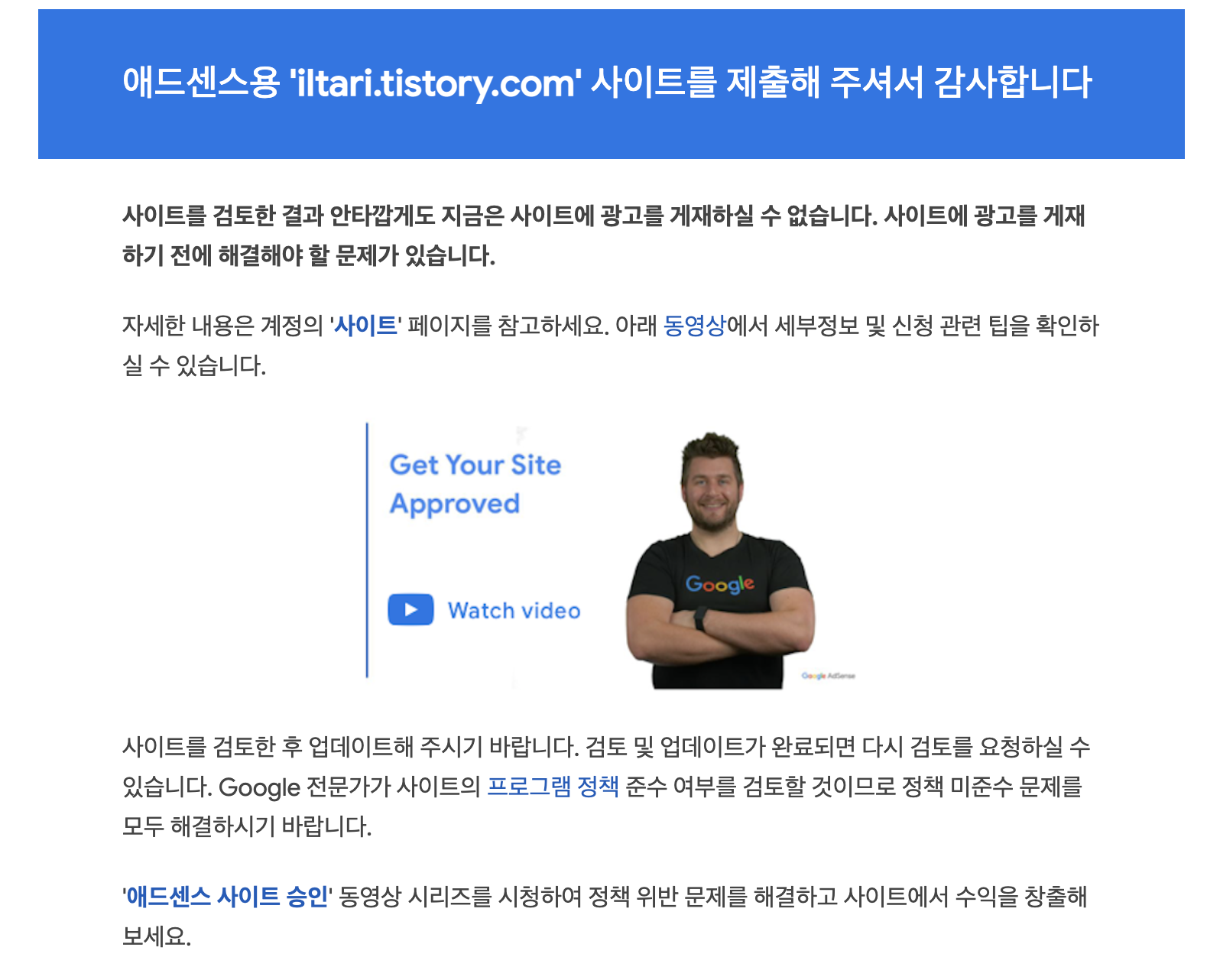 글자수가 충분하지 않더라도 일단 신청을 해보자는 마음으로 신청을 계속 했는데, 그때마다 '사이트를 검토한 결과 안타깝게도 지금은 광고를 게재할 수 없습니다. 사이트에 광고를 게재하기 전에 해결해야 할 문제가 있습니다' 라는 답변을 받았다.